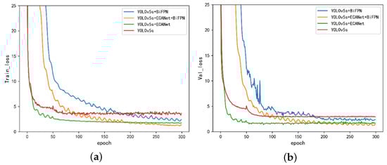 From Figure 15, it can be seen that YOLOv5s converges the fastest, and the Ours 1 (YOLOv5s+ECA-Net+Soft-NMS) also converges faster and basically leveled off at 100 rounds. It can be seen that the Ours 2 (YOLOv5s+Bi-FPN+Soft-NMS) and the Ours 3 fusion algorithm (YOLOv5s+ECA-Net+Bi-FPN+Soft-NMS) converge slower and level off at about 200 rounds, which is due to the increase in computation due to the increase in model size, and it sacrifices the convergence speed in exchange for higher accuracy.