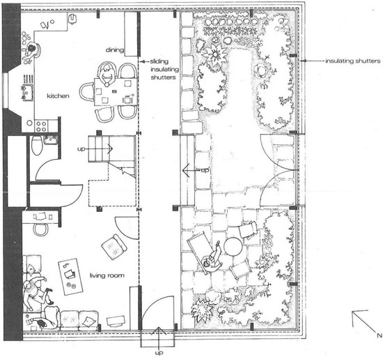 A full-scale mock-up of the house for a family of four was constructed (with a floor area of 65 m2), with an external pending glass facade facing the south (Figure 1, Figure 2, Figure 3, Figure 4 and Figure 5) [46]. The research group worked on the technical efficiency of the house in terms of self-sustainment of energy and food. In addition to that, as noted by James Thring, the group regarded the high levels of comfort of the modern house [6]. The interiors were spacious and had movable partitions for the different seasons. An internal wall created a minimum enclosure for the most severe weather. It consisted of insulating screens that could be opened towards the double-height greenhouse space of 46 m2. It was an in-between indoor/outdoor living space. This space was used to cultivate plants and vegetables, and it could be closed or opened depending on the season. It could also be used for a children’s play area, and it was a volume into which the family could extend when the weather was appropriate. It could offer facilities comparable to those provided by a conventional garden while being available for a more significant part of the year [46]. The high greenhouse space took half of the house volume and, if necessary, could be shut off to reduce heating load. It could provide approximately a quarter of the total yearly amount of food, imparting a sense of spaciousness [43]. The AHP was fully autonomous except for one-third of the food production, which had to be produced somewhere else. The wind provided electricity and space heating; the sun provided space and water heating; a methane digester transformed waste into gas for cooking; precipitation was collected, drinking water was retrieved from a well; and the greenhouse and a productive garden provided food [43]. Wind turbine, solar collectors, water reuse, thermal storage, and food production were all integrated within the building’s volume.