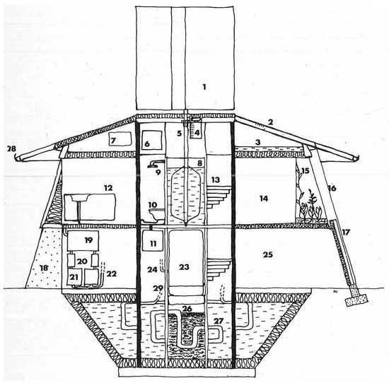 James Thring and Gerry Smith proposed a solution similar to Alexander Pike’s Autonomous House. It is a smaller house with occupancy for three people (Figure 6). One of the main innovations is the movable solar collector working also as insulation panels during the night. The shutters are lowered during the day to admit light to the first floor and raised during the night as insulating shutters. The space for installations is below instead of beside the living space, which allows a useful double function of the solar collectors. That space can also be used for garaging, service elements, and livestock. Most of the services providing energy, food, and water are contained in the central core, integrated into the volume of the building. This house is also 100% autonomous, except for food production. In this case, wind energy provides electricity and space heating, whereas solar energy provides hot water and space heating. A methane digester produces gas from waste for cooking. Rainwater is reused, and livestock and the garden produce a significant part of the food [48]. The living space is entirely on the first floor. Service spaces and technological installations take up the basement, ground floor, roof, and under-roof spaces. The central structural resilient core supports the vibrating wind turbine and hosts the stairs, shower, toilets, and several MEP (i.e., mechanical, electrical, piping) installations, such as the methane digester, heat exchanger, grey water tank, wind tower, and electric batteries. The wind tower integrated into the building structure becomes a design opportunity rather than a constraint. This architectural element, functioning as both a technical and a spatial device, developed further from the wind turbine of Alexander Pike’s house. The latter was placed on top of the roof, supported by four columns and reinforced by four cables tied to the roof’s corners.