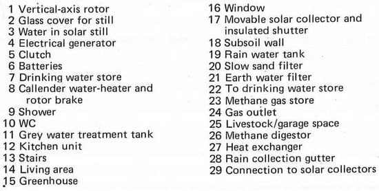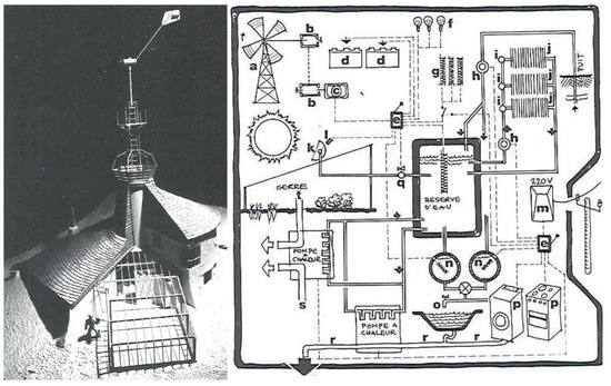 Mock-up of the Damir Perinic Autonomous House with the rectangular greenhouse breaking the cylindrical volume of the house (left); diagram of the installations and the technologies (right): a—wind turbine; b—hydraulic motor converters on multipliers; c—alternator; d—accumulator; e—circuit breaker, regulator, protection; f—lighting; g—auxiliary heating; h—circulation pump heating; i—thermostatic valve; j—convector; k—adjustable solar collector; l—thermostat; m—box E.D.F.; n—hot water; o—sanitary ware; p—device; q—circulation pump + motorized valve; r—wastewater network, domestic hot water lost; s—stale air home, natural ventilation; t—hot air ventilation (Domus, 1978).