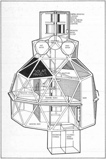 This article also partially fills a research gap regarding the ecological design and its relation to cybernetics during the 1970s. The analysis of experimental ecological design during the 1970s, including autonomous houses, is also relevant because the major histories of modern architecture, such as Curtis’ Modern Architecture Since 1900 [8], Frampton’s Modern Architecture: A Critical History [9], Colquhoun’s Modern Architecture [10], and Tafuri and Dal Co’s Modern Architecture [11], do not focus extensively on it [12]. Autonomous houses rarely figure in architectural history or are treated as specific phenomena [13], decontextualized and disconnected from the non-ecological architecture. Although architectural critic Reyner Banham in his 1969 book, The Architecture of the Well-tempered Environment [14], examined the role of technology and utilities in architecture, he did not address the question of energy autonomy [15]. Autonomous housing analysis is still limited also in recent historical surveys of sustainable architecture and ecological design [13,16,17,18,19,20].