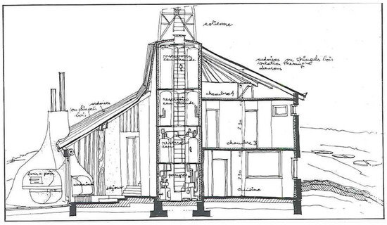 In 1977 French architect Damir Perinic, taking the Cambridge group’s autonomous houses as a reference, designed an autonomous house published in Domus [49]. It was for a single household, located in the forest of Rambouillet near Paris. The house produces about 90% of the energy needed for heating and meets 100% of water demand. In terms of performance and technical installations, the wind is the most critical energy source. The water is heated via the wind turbine and solar energy and the total living area of 148 m2 is more significant than the English ones. The installations integrated into the architectural form of the building are a wind turbine, solar collectors, a greenhouse producing food, and a water cycle system [49]. The greenhouse breaks the circular shape of the house, allowing the bedrooms to face the south and receive solar light through the greenhouse. The living room with a massive fireplace/oven is on the northern side. The room does not receive a large amount of direct solar light, which would bring natural warmth in winter. In effect, between the living room and the southern greenhouse, the location of the central core with the technical installations obstructs the access of southern solar light. In addition, the core structurally supports both the house and the wind tower. Moreover, it contains stairs, water storage, pipes, and pumps. The core and the greenhouse both function as technical and spatial devices.