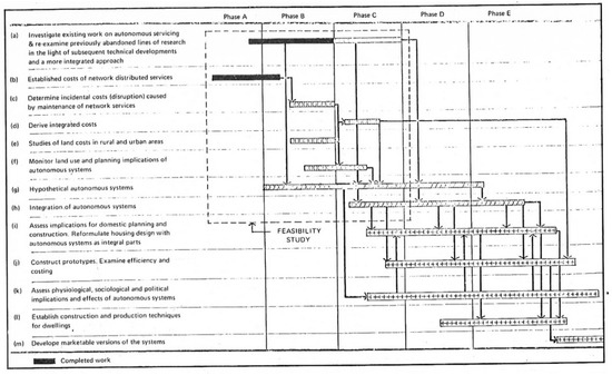 Alexander Pike and James Thring, diagram about the Research Programme for an Autonomous Servicing System. James Thring’s work on the costs of network-distributed services, (b), forms an essential basis for establishing target costs for autonomous systems. Work on (e,f) tests the validity of these systems for building on unserviced, underdeveloped, and marginal areas of land, which might provide greater freedom of choice when making planning decisions. Investigations under (g,h,k) are multidisciplinary, requiring studies in biology, chemistry, engineering, geography, psychology, physics, physiology, and sociology. Development in sections (j,l,m) requires the cooperation of industry. The phases represent divisions between separate sections of the work for evaluation of findings and method of financial support. No time scale can be added at this stage (Architectural Design, 1972).