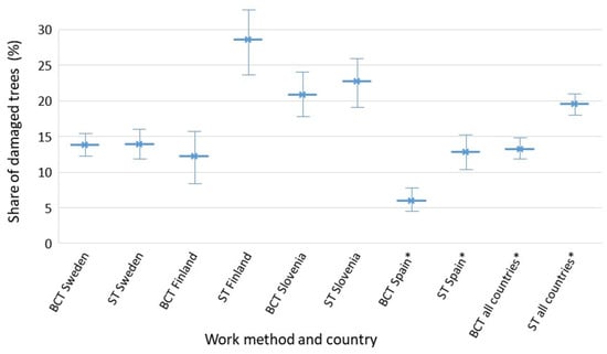 Despite the fact that impacts on biodiversity were not assessed directly in this study, higher biodiversity indexes for BCT compared with ST may be expected []. The study’s main limitation is related to the assessment of damaged trees after thinning and before forwarding, which was only carried out along the strip road and not in the transects, because the felled trees made assessment impossible within the transects before forwarding. Therefore, the after thinning but before forwarding quantification is reported as the number of damaged trees per 100 m of strip road and not per ha. The after forwarding measurements were influenced by the forwarding work, which was performed with a different machine in each country. Nevertheless, any damage caused by the forwarder in each country was identified and quantified. The sampling design included perpendicular transects to the strip roads, which helped eliminate the potential bias of overestimated overall damage levels because the areas of greatest machine activity, and therefore the greatest potential damage, are expected to be close to the strip roads.