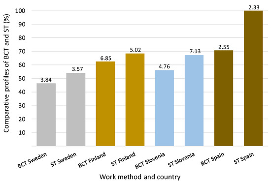 BCT exhibited the lowest emissions in all the environmental impact categories considered (Table 11). In terms of greenhouse gas emissions (GHG), BCT emissions were 14%, 9%, 16% and 29% lower than ST in Sweden, Finland, Slovenia and Spain, respectively (Figure 4). The higher productivity of BCT (Table 3) explains these differences, because the GHG emissions were mainly the result of diesel combustion by the harvester. The harvester and diesel production made a minor contribution to CCP.