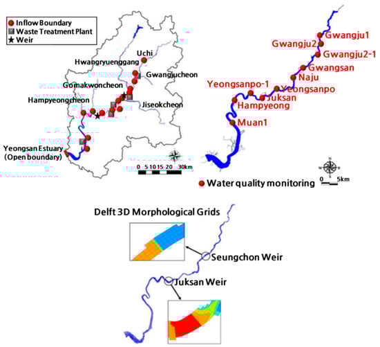 This study is a project planned over a total of three years. The main contents of the previous study were the changes in aquatic ecology due to changes in water quantity, and the one target fish species in Yeongsan River was applied [35]. However, this study aimed to qualitatively and quantitatively evaluate how physical and chemical changes in a river affect the habitats of aquatic organisms inhabiting the ecosystem. Based on our analysis, we present management plans from an integrated water management perspective by developing an integrated hydraulics–water quality–aquatic habitat prediction model suitable for the Yeongsan River system. To this end, we used the Delft3D model (a three-dimensional (3D) numerical model developed by Deltares in the Netherlands) and HABITAT (a habitat model). The Delft3D model can evaluate changes in the hydraulics, riverbed, water quality, and algae, according to various prediction purposes, and it can be linked with the HABITAT model to evaluate habitat suitability for various species. In this study, the Delft3D-FLOW, Delft3D-WAQ, and HABITAT models were linked for the freshwater section in the main stream of the Yeongsan River. Accordingly, we evaluated how changes in the physical and chemical environments (a result of the multi-function weir operation) affected aquatic habitats in the study area. The integrated hydraulics–water quality–aquatic habitat prediction model constructed in this study is expected to be a useful analytical tool for the management of various aquatic ecosystems in rivers.