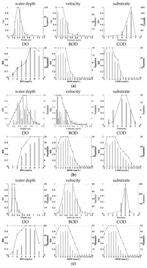 Habitat suitability curves (HSCs) of the physical (water depth, velocity, substrate) and chemical (DO, BOD, COD) variables for the target species. (a) Squalidus chankaensis tsuchigae; (b) Cyprinus carpio; (c) Micropterus salmoides.