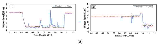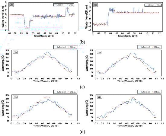Comparison of simulated and observed water levels and water temperature at (1) the Seungchon Weir and (2) the Juksan Weir. (a) Model calibration (water level); (b) model verification (water level); (c) model calibration (water temp.); (d) model verification (water temp.).