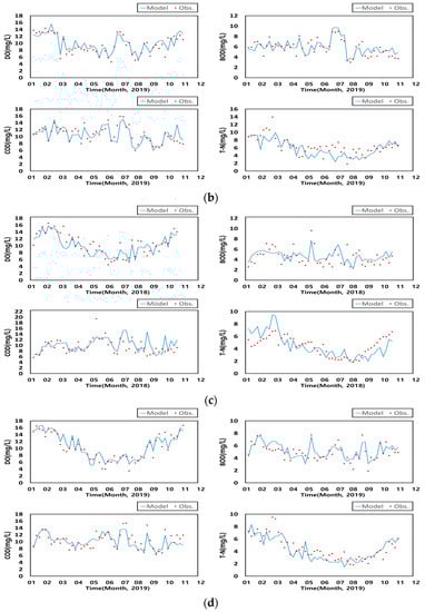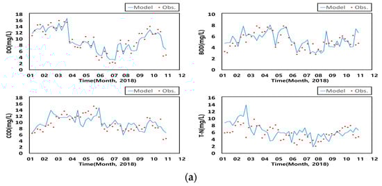 To examine the reproducibility of water quality-related items using the Delft3D-WAQ model, the simulated and observed values were compared for dissolved oxygen (DO), biochemical oxygen demand (BOD), chemical oxygen demand (COD), and total nitrogen (T-N) at representative locations in the Seungchon and Juksan Weirs. The Bias values ranged from −5.15 to 5.83 mg/L; MAE from −2.25 to 3.58 mg/L; NSE from 0.65 to 0.82; Pbias from −5.75 to 7.18%; and IOA from 0.66 to 0.80 (Figure 5).
