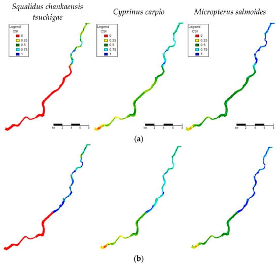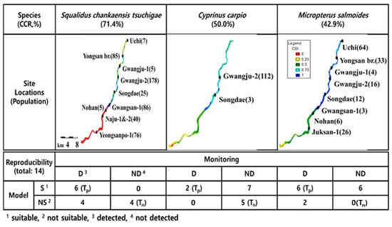 Figure 6 shows the reproducibility of model results for the target species using the correct classification rate. The CCR values of Squalidus chankaensis tsuchigae, Cyprinus carpio, and Micropterus salmoides were 71.4%, 50.0%, and 42.9%, respectively. Squalidus chankaensis tsuchigae was found to be the dominant species inhabiting the Yeongsan River and showed high prediction accuracy when compared with the actual monitoring results. For Cyprinus carpio, the observed and calculated habitat suitability metrics were inconsistent because the actual number of observations was insufficient for proper analysis. If various monitoring data are recorded and used in future analyses, the accuracy of the results and model reproducibility are expected to improve. Micropterus salmoides is known to be highly adaptive to environmental changes, as it is a carnivorous species and exhibits lentic and lotic habitat characteristics [47,48,49,50,51].