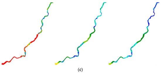 As detailed above, three weir operation conditions were applied to the HABITAT model (Figure 7). Both the Seungchon and Juksan Weirs were partially opened under Condition 1, whereas the Seungchon Weir was fully opened and the Juksan Weir was partially opened under Condition 2. Under Condition 3, the Seungchon Weir was partially opened and the Juksan Weir was fully opened.