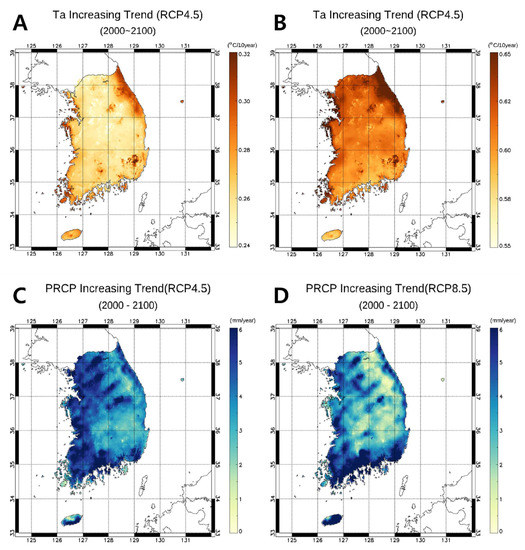Temperature (Ta) (A,B) and precipitation (PRCP) (C,D) increasing trends for one hundred years (2000–2100) predicted for South Korea, under RCP4.5 (C) and RCP4.5 (D) scenarios. Note the differences of color bars’ scale of temperature increasing speeds.