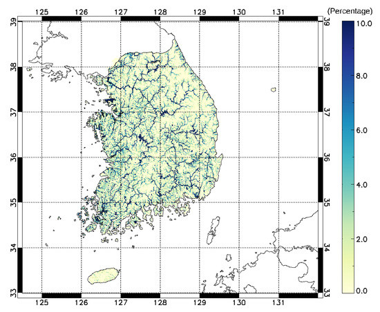National water portion map of Korea gridded in a 1 × 1 km resolution.