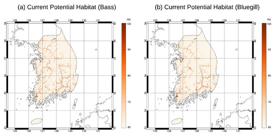 The indices for modelling performance, true skills statistics (TSS), and receiver operating characteristic (ROC) were relatively high: 0.79 for TSS and 0.97 for ROC. According to the modelling contributions of the input variables, the water portion map showed the highest contribution to modelling for both alien fish species, 93.6% for largemouth black bass and 83.8% for bluegill (Table 2). This indicates that proper habitat information is crucial for modelling these species. In addition, these results show that the water portion information in this study may make it easier to apply SDMs to regional-scale modellings regardless of spatial resolution, especially for freshwater ecosystems. The next most important variable was BIO1 for both species, implying that it is a climate-related environmental descriptor for freshwater ecosystems. In fact, BIO1, mean atmospheric temperature, is not a direct habitat characteristic, but due to the general relationship between atmospheric and freshwater temperatures, it is indicated that the future increase in atmospheric temperature will affect the species habitat distribution in the SDMs. In contrast, precipitation-related BIOCLIMs and slope information had relatively low contributions. Information of the model predictions to input variables were provided in Appendix A.