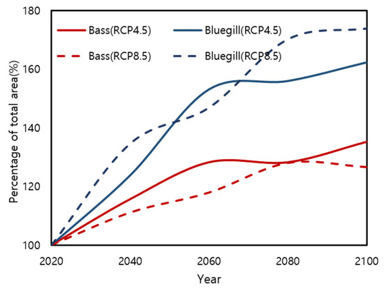 Future simulations showed that habitats with a high probability would increase by 2100 (Figure 5). Based on the current total areas of 70% or higher probabilities, the area percentages of largemouth black bass were predicted to expand up to approximately 130% and 125% by 2100 under RCP 4.5 and 8.5 scenarios, respectively. Similarly, those of bluegill were predicted to expand up to 160% and 170% by 2100 under RCP 4.5 and 8.5 scenarios, respectively.