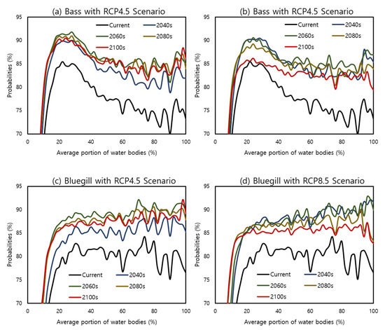 Figure 6 shows the relationship between future potential habitats and water bodies. The high habitat probability (70% or higher) under the current status was observed in regions (or grids) with 12% or higher for largemouth black bass, and 15% or higher for bluegill water bodies. The peak habitat probability for largemouth black bass occurred at approximately 25% of the water portion, while the maximum habitat probability of bluegill was saturated at approximately 30% of the water portion and then started to fluctuate at approximately 80% of the probability. Although the habitat distribution patterns differed between the species, this indicates that the water portion is the most influential factor in describing the habitat characteristics of both species in the models. Interestingly, future simulations showed an increase in habitat probabilities for almost all magnitudes of river channels, implying a strong impact of climate change on the expansion of alien fish species. In addition, high distribution probabilities appeared in the lower water part area over time, implying that climate change may cause alien fish to expand toward smaller magnitudes of river channels.