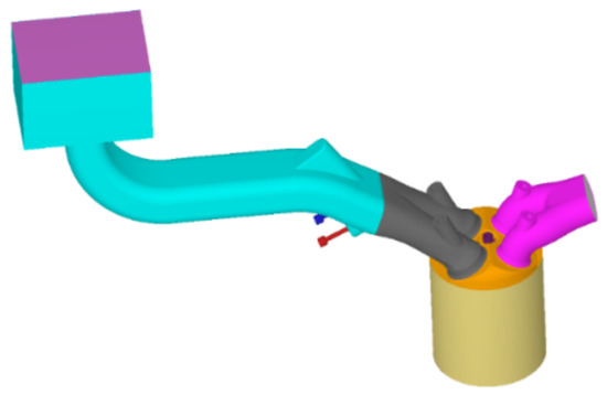 The experimental HICE had four cylinders, the difference among which was ignored to simplify the model. The three dimensions (3D) entity model we built consisted of one surge tank, one inlet, one cylinder, two intake valves, two exhaust valves, and a hydrogen injection valve, as shown in Figure 1. The 3D model file in STL format was imported into the CONVERGE Studio. After detecting and repairing the geometric surface of the model and then defining the boundary type and boundary condition of each region, the surface grid file of surface.dat was generated. In the simulation process, the software automatically generated the grid based on the preset grid-generation rules.
