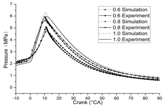 The simulation model was verified by the previous experimental data in reference [49,54]. The experimental data were compared with simulation results, as shown in Figure 2, which shows the in-cylinder pressure curves of simulation and experimental data at the speed of 3000 r/min and the equivalent fuel–air ratio of 0.6, 0.8, and 1.0. It can be seen that the in-cylinder pressure curves from simulation match well with that from the experiment, among which the peak value of the in-cylinder explosion pressure from simulation calculation is slightly higher than experimental data, and the error of average pressure is less than 5%.