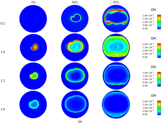 According to Figure 3, OH was mainly distributed on the front surface of the flame, and the concentration of OH was the highest on the front surface. Due to the influence of the internal structure of the cylinder, such as the spark plug, an irregular flame shape appears in the center of the cylinder when the fuel burns at 5%. As the combustion continues, the flame spreads rapidly from the center of the cylinder to all sides, and the flame radius expands rapidly. The outside of the flame is the unburned zone; the OH concentration is zero, the inside of which is the burned zone. The closer to the center of the burned zone, the more complete the fuel combustion is, and the OH concentration spreads from the center of the burned zone to the front of the flame.