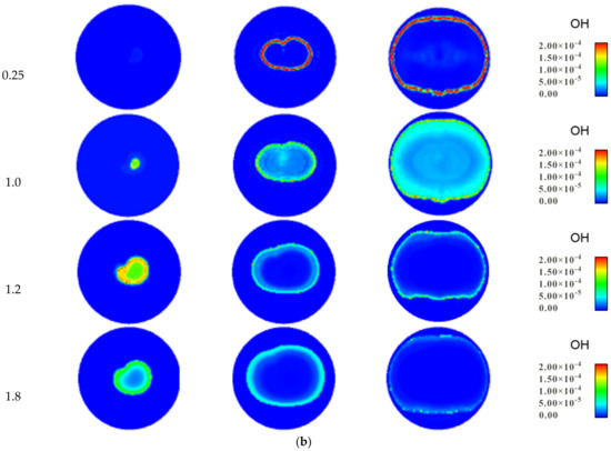 During the rapid combustion period, OH concentration increases rapidly with the increase in crankshaft angle. With the increase in the fuel–air ratio, the peak concentration of OH is higher, and the rise rate of OH concentration is faster, indicating that with the increase in the fuel to air ratio, the combustion in HICE is more rapid. During the expansion period, the concentration of OH decreases rapidly, because as an intermediate product of hydrogen–oxygen reaction, the temperature in the expansion period gradually decreases, and the reverse reaction gradually increases, resulting in the disappearance of OH with the end of the combustion in the cylinder.