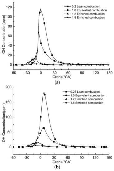 During excessive hydrogen combustion, the concentration of OH decreases significantly compared to that of equivalent combustion, but the crankshaft angle with the peak OH concentration is earlier than that of equivalent combustion, and with the increase in excess hydrogen, the peak of OH concentration decreases and the crankshaft angle with the peak of OH concentration decreases gradually. The in-cylinder concentration of H elements in excessive hydrogen combustion is high, which causes a large number of H and OH elements reactions and generates water quickly, reducing the concentration of OH.