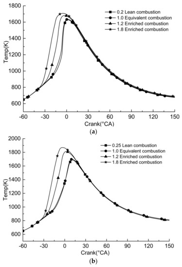 Figure 6. Variation of in-cylinder temperature change with the crankshaft angle in different combustion modes under low load. (a) Loading rate of 20%; (b) loading rate of 25%.