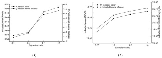 Figure 7. Variations of indicated power and indicated thermal efficiency in different combustion modes at low load. (a) Loading rate of 20%; (b) loading rate of 25%.