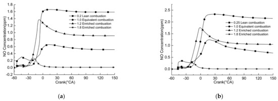 Figure 8. Variation of NO concentration in cylinder with crankshaft angle in different combustion modes under low load. (a) Loading rate of 20%; (b) loading rate of 25%.