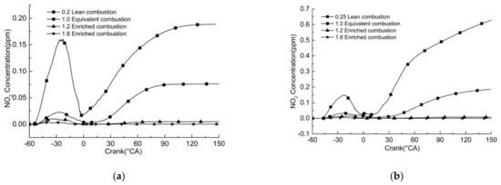 It can be seen from Figure 9, that under the same load, NO2 concentration slowly increases with the increase in the crankshaft angle; the peak concentration of NO2 is 0.63 ppm at a fuel–air ratio of 0.25. The concentrations of NO2 in all three combustion modes are no less than 0.2 ppm, which is a very low level.