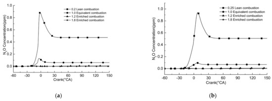 Figure 10. Variation of N2O concentration in the cylinder with crankshaft angle in different combustion modes under low load. (a) Loading rate of 20%; (b) loading rate of 25%.
