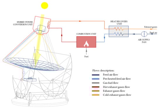 The operation of the hybrid dish-Stirling system (see Figure 1) employs high-temperature gases produced by the oxidation reaction of the fuel gas in the presence of air in the combustion chamber. These gases flow towards the power conversion unit (PCU) providing the high-temperature thermal power required for running the Stirling engine. In this way, the working fluid (hydrogen, air, or helium) reaches its nominal temperature and pressure conditions necessary to evolve inside the Stirling engine and perform the thermodynamic transformations of the homonymous cycle. Downstream of the heat exchange in the PCU, the still hot exhaust gases are sent to a heat recuperator in order to preheat the countercurrent feed airflow.