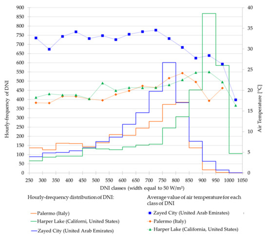 - The three selected locations have hourly DNI distributions with peaks falling into quite different DNI classes: the distribution of DNI for Palermo presents a peak of 385 h per year falling in the DNI class between 800 and 850 W/m²; the one for Abu Dhabi presents a higher peak of 601 h per year falling in the DNI class between 750 and 800 W/m²; and finally, the one for the Mojave Desert presents the highest peak of 868 h per year falling in the DNI class between 900 and 950 W/m².