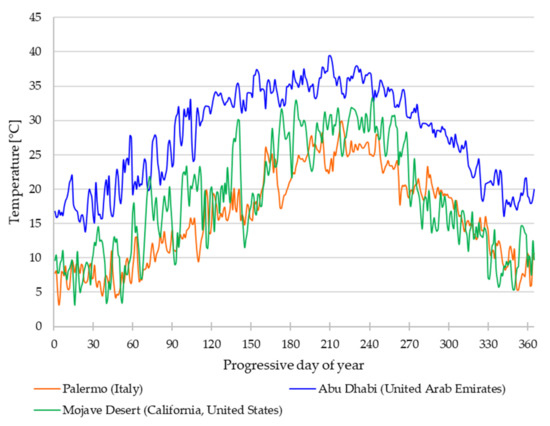 - Figure 5 shows that Abu Dhabi is the warmest location throughout the year compared to the other two studied locations. The average daily temperatures range between 13.7 and 39.4 °C in Abu Dhabi, between about 3 and 33.3 °C in the Mojave Desert location, and between 3 and 29.9 °C in Palermo.