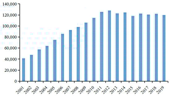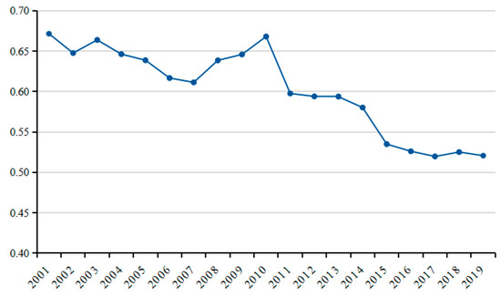 The results showed that, from 2001 to 2019, the energy carbon emission efficiency of the Yangtze River Delta urban agglomeration showed a fluctuating decline (Figure 3), with the average value changing from 0.671 in 2001 to 0.522 in 2019. In 2001–2004, because of the implementation of strict energy conservation and emission reduction and environmental protection initiatives in China, the carbon emission efficiency of cities was generally high, and showed an upward trend from 2005 to 2010. After 2010, with the arrival of an energy conservation and emission reduction bottleneck, the rapid industrialization of the Yangtze River Delta region, and the impact of the economic crisis from 2004 to 2008 [45], the carbon emission efficiency decreased. After 2015, cities in the Yangtze River Delta region entered the industrial restructuring and transformation period one after another, and the carbon emission efficiency stabilized. With the implementation of the overall strategy of high-quality development and ecological civilization construction in the Yangtze River Delta urban agglomeration, the energy carbon emission efficiency of some cities increased. With the implementation of the Yangtze River Economic Belt’s high-quality development and the overall strategy of ecological civilization construction, the energy carbon emission efficiency of some cities improved significantly.