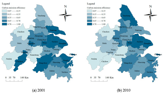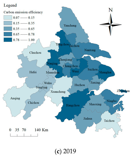 Spatial pattern of carbon emission efficiency in the Yangtze River Delta urban agglomeration from 2001 to 2019. (source: mapping through ArcGIS 10.8 software).