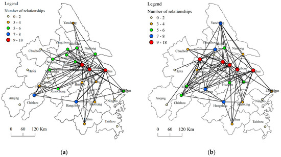 Spatial correlation network of carbon emission efficiency in the Yangtze River Delta urban agglomeration. (a) 2001; (b) 2019.