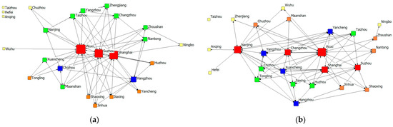The core−edge structure pattern diagram of carbon emission efficiency in the Yangtze River Delta urban agglomerations. (a) 2001; (b) 2019.