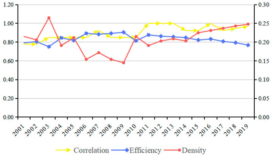 - Overall network structure features. The overall network structure features were measured by three indicators: density, correlation degree, and efficiency of carbon emission cyberspace. Among them, the network density reflects the tightness of the whole network structure. The greater the network density, the closer the carbon emission efficiency relationship between cities. Network correlation degree reflects the connectivity between cities in a spatial network. The fewer isolated cities in the network, the greater the correlation degree of the network. Network efficiency reflects the connection efficiency between cities in the spatial correlation network. The more associations that exist between cities, the more stable the network, and the lower the network efficiency [37].