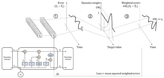 The concept of the LSTM model with a dynamic weight. After feedforward propagation, ① the errors are calculated from outputs of the LSTM and target values; ② some errors are amplified according to their dynamic weight; and ③ the loss is calculated by loss function, i.e., the MSE in this study, and the gradient is back-propagated to update weights and biases in the LSTM model.
