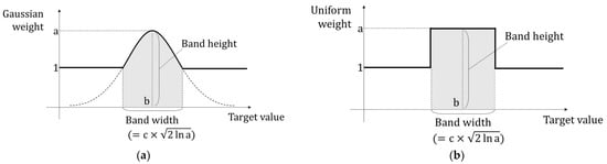 As shown in Figure 1 and Equations (2) and (4), we introduced Gaussian weights to MSE. The weight function is a symmetric shape with a peak. It smoothly decreases from the peak, especially slowly just around the peak. Simple Gaussian weight leads the LSTM model to ignore errors at very low or high target values because the Gaussian function converges to zero at the tails. As shown in Equation (4), a band determined by the coefficients of Gaussian function was introduced to overcome this ignorance. The Gaussian coefficient b determines the center of a band. The coefficients of a and c control the band width, which determines the boundary where the Gaussian weight is not less than one. Additionally, a uniformly weighted MSE in Equations (3) and (5) with the same height and width as the Gaussian case was also used for comparison. Figure 2 shows the weight functions that were introduced.