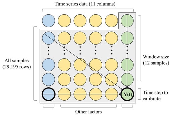 Figure 3 shows the input and output structure trained to the LSTM model. The blue, yellow, and green circles indicate the input data. The green circles also indicate the output target value. At each step, a set of rows in the gray frame was shifted into the model, just to convey the input sequences and target value to the LSTM model. The window-sized length of the input sequences in the grey frame was conveyed to train the model at the same time. The time step for the output could be set to one because calibration does not require multi-dimensional outputs. The task given to the LSTM model was calibration, which coercively adjusts the measurement from the LCS, indicated by the bold circle in the left bottom corner, to the target value from a reference measurement, the bold circle in the right bottom corner in Figure 3. Note that the output of the LSTM model is not a future value, but the present value at the same time.