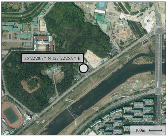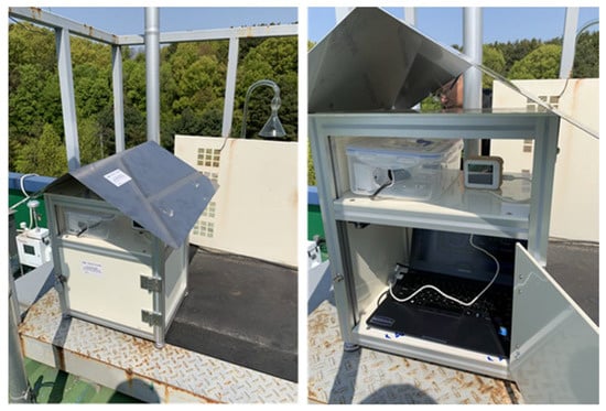 Figure 4 and Figure 5 show the experimental setup at the Daejeon Institute for Health and Environment where the concentration of PM2.5 was measured by the SMG, using the beta-ray absorption method and gravimetric method, for public use in Daejeon city. A commercial LCS product containing a PMS 7003M manufactured by Plantower [35] was installed next to the air sampler of the equipment. The experimental installation required a roof to protect the sensor from rainfall and direct sunlight. The sensor was placed at the height of the air sampler to maintain a distance to avoid heat interference. There was no interruption of air flow near the sensor.