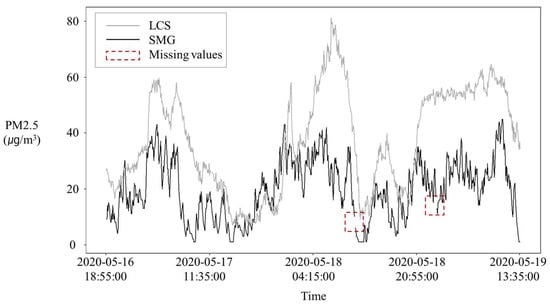 PM2.5 was measured every 10 s from May 2020 to August 2020 using the LCS with the PMS 7003M. The same PM2.5 was also measured by the SMG using a 5014i Beta Continuous Ambient Particulate Monitor from Thermo Fisher Scientific, Waltham, MA, USA [36]. The SMG measured every 5 min and its measurement was used as the target value in the LSTM model. The data from the LCS was averaged every 5 min to match the target values of the SMG. A total of 29,195 observations were used as the input sequence for the LSTM model.