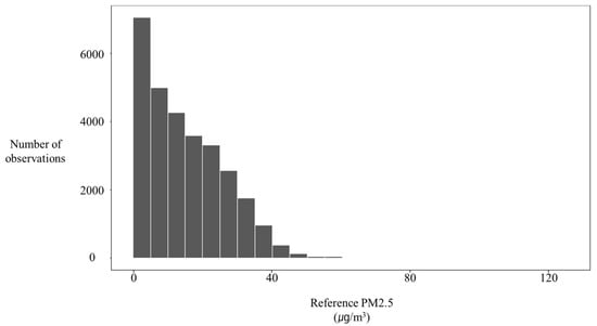 The bar histogram of collected PM2.5 concentrations. (The histogram shows positive skewness with a right tail.)