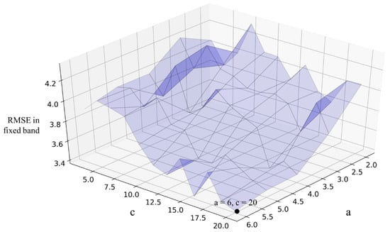 The change in RMSE in a fixed band with different coefficients for the dynamic weight. Coefficients a and c determine the height of the peak and the width of the band, respectively. The dynamic weight with coefficients at the black point on the graph showed the best calibrating performance in a fixed band with RMSE of 3.77.