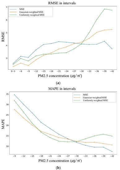 Since coefficients a and c in both bands were similar when the best RMSE was observed, we chose (a, b, c) to be (6, 20, 20). In addition, then, LSTM models with differently weighted loss functions were compared to check the calibration performance within given individual intervals. In the data used as the test set, the interval was divided according to the target value of PM2.5 and the calibration performance. When the target value was very low, the MAPE was highly distorted and meaningless, so it was calculated from a target value of 6 or higher. Both graphs in Figure 9 clearly show that a weighted loss function near the peak improves the calibration performance, causing a trade-off at a concentration of PM2.5 above 30. That is, the RMSE and MAPE values in a given band improved, while they became worse outside of the band. Comparing the MSE with no weight and Gaussian-weighted MSE, under 27 the calibration performance was improved, but it deteriorated above 27. A better improvement and larger trade-off were observed for the uniformly weighted MSE.