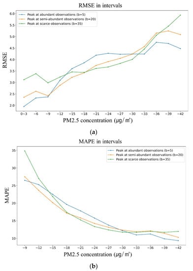We additionally checked the performance of the model by assigning the band center at 35 μg/m3 of PM2.5, as shown in Table 6. As shown in Figure 10, in the right-skewed data, it was predicted that, when the peak was placed in a section with relatively small observations (b = 35), the performance indicators—RMSE and MAPE—of a very low concentration are lower than those of other cases and, at the same time, they were not improved on the peak. Rather, it performed better by predicting better near the peak, not on the peak. It was even confirmed that the performance slightly improved when the peak was set at 20.