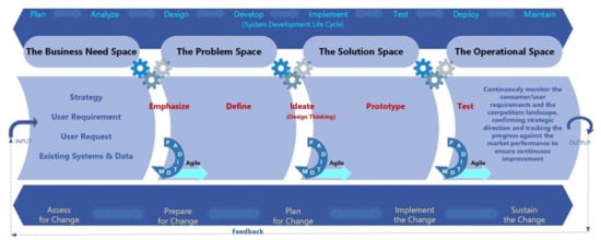 Structured processes, such as Business-Need, Design Thinking, Agile, and Change Management, are applied and familiar in many enterprises. The application of the structured processes is often localized to specific business units (departments), specific phases of the product/service lifecycle [], and specific domains. For example, design thinking is applied in the problem space during the initial phases of the problem discovery stage, while agile methods are being used in the solution space during the product execution stage.