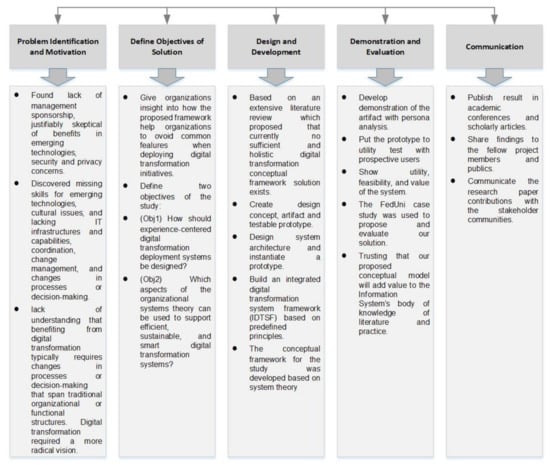 To explicate the design of the solution that fulfills the objectives, we carried out an extensive literature review that proposed that, currently, no sufficient and holistic digital transformation conceptual framework solution exists. Hence, the IDTSF model was proposed through several iterations to ensure a complete and sound solution.