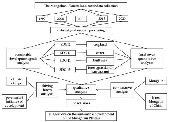 These studies have advanced our understanding of land use changes for Mongolia and Inner Mongolia at different spatial and temporal scales as well as during specific periods. However, few studies provided a complete and comprehensive picture of land use and land cover changes refer to the 2030 SDGs in the Mongolian Plateau over the past 30 years. Thus, a gap exists to analyse the existing land use and land cover data to support management and research efforts to achieve the SDGs in the Mongolian Plateau. The aim of this study is to elucidate the general sustainable development status of the Mongolian Plateau using land cover data for the years 1990, 2000, 2010, 2015 and 2020, and to compare differences in its two different geographical units in Mongolia and Inner Mongolia, China. The driving forces of land use and land cover change in the Mongolian Plateau were also studied and discussed with the goal of providing a reference for the implementation of SDGs in the Mongolian Plateau.